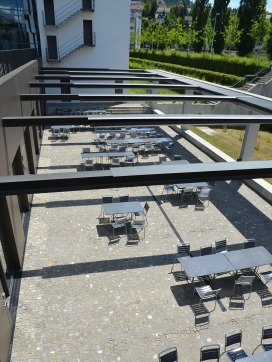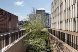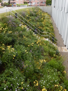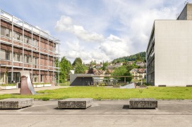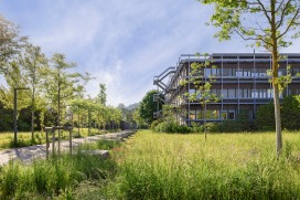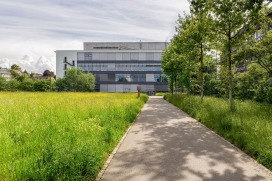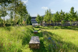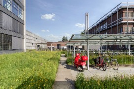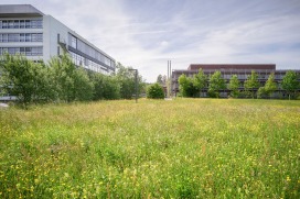 Das Areal bietet insgesamt rund 2000 Arbeitsplätze, davon 840 im neuen Gebäudeteil. Der Aussenraum schafft vielfältige Aufenthaltsbereiche mit sonnigen und schattigen Plätzen für die Mitarbeitenden. Die Umgebung beinhaltet mehrheitlich extensiv genutzte und extensiv unterhaltene Flächen. Unterschiedliche, mit vorwiegend einheimischen Arten angelegte Wiesenflächen und Staudenrabatten in verschiedenen Expositionen garantieren eine grosse ökologische Vielfalt und Nischen für mannigfaltige Fauna und Flora: Von der humusierten Wiese zu Magerwiesen, von Trockenstandorten zu teilweise überfluteten Flächen in den Retentionsanlagen. Eingepflanzte Zwiebelpflanzenfelder sorgen bereits im Frühjahr für Blütenpracht. Die mäandrierenden Eichenpflanzungen durchziehen das gesamte Areal, binden es zusammen und spenden Schatten in den Aufenthaltbereichen für die vielen Mitarbeiter. Bereiche mit einheimischen Sträuchern und Heistern ergänzen das räumliche ökologische Repertoire.