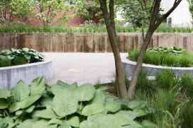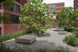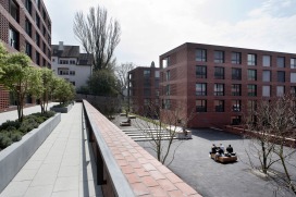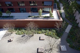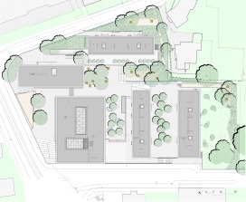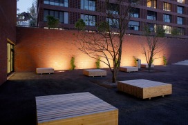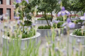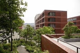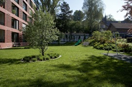 Das Gelände am Hang wird durch eine Abfolge von Terrassen, Mauern, Treppen und Rampen für die Bewohner nutzbar gemacht. Es sind spannende, abwechslungsreiche Aussenräume mit unterschiedlicher Ausgestaltung und Zuordnung entstanden. Anwohner, Schüler und Büroangestellte nutzen die Frei ächen als Aufenthalts- und Spiel ächen, als Studier- und Erholungsort. Jeder Raum hat seiner Funktion und Zuordnung entsprechend eine eigene Ausprägung. Der private Park ist der am stärksten durchgrünte Anlageteil: Die artenreiche Staudenp anzung, Bäume, Heister und Zwiebelp anzen sorgen während einer langen Zeit im Jahr für abwechslungsreiche Blütenbilder. Im Wohnhof spenden Blasenbäume Schatten und bieten Schutz vor Einsicht. Die Fläche kann für Anlässe, Spiel und Kommunkation genutzt werden, der Hof ist Begegnungs- und Bewegungsraum. Der Pausenhof liegt direkt am Aussensitzbereich der Caféteria. Er ist Aussenzimmer für die Studierenden, die sich im Schutze und Schatten der Felsenbirnen in Freien erholen und lernen können. Der Zentralhof ist die Drehscheibe der Gesamtanlage und wird von allen gemeinsam genutzt. Sonnige und schattige Bereiche wechseln sich ab. Das Wasserbecken spielt mit den unterschiedlichen Niveaus, bereichert den Ort gestalterisch und verbessert das Klima im Innern. Die Stellung der Gebäude definiert im Westen einen zur Stadt ausgerichteten Platz, der offen ausgestaltet ist, der Gloriaplatz: Die Skulptur von Piero Maspoli, eine geländespezi sche Intervention aus Bärlocher Sandstein, überwindet die Niveaudifferenz und dient auch als Sitzskulptur. Die unterschiedlich ausgestalteten Aussenräume ergeben ein spannendes und abwechlungsreiches Ganzes und sind innerhalb der einheitlich und ruhig gehaltenen Gebäudefassaden identitätsstiftend.