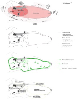 Die Gesamtanlage weist zwei sich überlagernde Grundelemente auf: Die weiche Landschaft der Gurtenwiese mit freiem Wegesystem einerseits und andererseits der strenge, zurückversetzte Komplex des Gurten-Kulm. Vom Hotel ausgehende Mauerfächer begrenzen die drei Hauptebenen und verbinden den alten Hotelkomplex mit den übrigen Aktivitätsbereichen, treten in ein wechselseitiges Spiel mit der freien Landschaft. Ein von Baumreihen flankierter Rundweg umschliesst den äusseren Perimeter. Entlang diesem Rundweg sind kleine Picknick- und Ruheplätze angeordnet.
