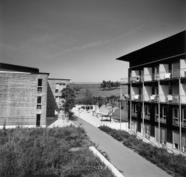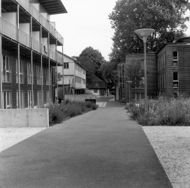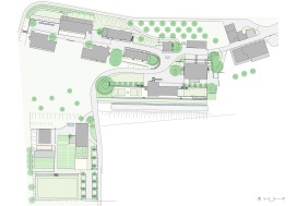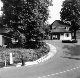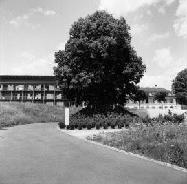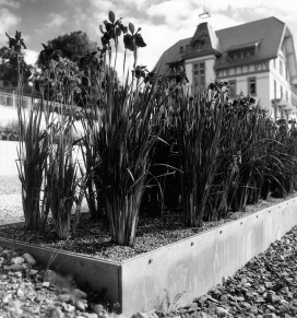 Die Klinik Südhang aus mehreren historischen Gebäuden, welche sich um einen zentralen Platz formieren und drei neuen Pantientenhäusern. Ein sich abwechselndes Wege- und Platzsystem bindet die weilerartige Häusergruppe zusammen. Markante alte Einzelbäume, eine neue rotblühende Rosskastanienreihe, alte und neue Brunnen und Wasserbecken, gespeist aus den vielen eigenen Quellen, prägen diese Orte. Magerwiesen, modelliert aus dem Aushubmaterial, umgeben die Neubauten, ein geometrisch gestalteter Senkgarten mit Rosen, Stauden, Buchs und Tessinerpalmen verdeutlicht Alt und Neu auch im Aussenraum. Ein 90m langes, mit Iris bepflanztes, Rückhaltebecken fasst Oberflächen- und überschüssiges Quellwasser und leitet dieses anschliessend in die mit dunklem Schotter gefüllte ebenso lange Versickerungsanlage.