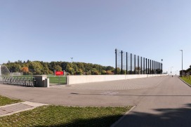 Im Zuge der Sanierungsarbeiten wurde der bestehende verfüllte Kunstrasen mit einem unverfüllten Kunstrasenteppich ersetzt. Der bestehende Aufbau bis und mit der Asphalttragschicht konnte dabei nach Prüfung auf Versickerung und Belastbarkeit im Zusammenhang mit den technischen Anforderungen wiederverwendet werden. Die bestehende Rasenbewässerung und die Spielfeld- und Strassenbeleuchtung wurden ebenfalls erneuert. Auf der nordwestlichen Seite wurde das Kunstrasenspielfeld um rund drei Meter verbreitert. In dieser Zone stehen Spielerkabinen und dient als Einlaufstrecke. Ebenso wurde ein neuer Zugangsweg erstellt, der die Trainingsfelder 1 und 2 erschlossen. Der Ballfangzaun sowie die Rasenspielfeldumzäunung wurden vollständig erneuert. Die komplette Zufahrtssituation zu den Aussenanlagen sowie zu dem Restaurant End der Welt wurden im Zusammenhang mit der geänderten Oberflächenentwässerung neu gestaltet. Zum Abfangen des Meteor- und Schmelzwasser wurde stirnseitig gegen die Strasse End-der-Welt eine Betonmauer mit mindestens 49 cm Anschlag zum Strassenniveau erstellt. Gegen das Spielfeld weist die Betonmauer eine konstante Höhe von 99 cm auf. Der neue Ballfangzaun wurde auf die Mauer montiert. Zur Verbesserung der Situation für die Mannschaftsbusse wurde ein Bereich aus Schwerlastverbundsteinen inkl. Wendemöglichkeit erstellt.