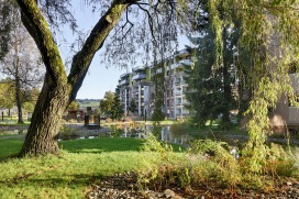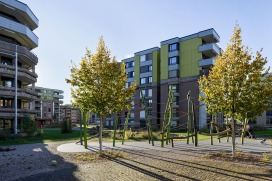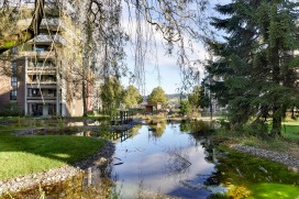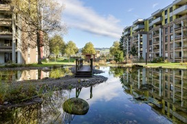 Im Lindendorf in Ostermundigen hat sich in den letzten zweieinhalb Jahren viel getan. Sechs von zwölf Mehrfamilienhäuser wurden aufgestockt und renoviert. Die siebte und vorläufig letzte Etappe wird nun bis zum Sommer fertiggestellt. Die Umgebungsarbeiten haben sich den Hochbauetappen angepasst, wobei die restlichen Mehrfamilienhäuser weiter bewohnt blieben und die Zugänglichkeit immer gewährleistet bleiben musste. Es wurden Spiel- und Aufenthaltsmöglichkeiten ergänzt, Velounterstände, Feuerwehrzufahrten sowie -Stellplätze gebaut und Solarleuchten als Wegbegleiter eingesetzt. Weitere Massnahmen waren die Ertüchtigung der Einstellhalle sowie die Erneuerung der bereits vorhandenen Teichanlagen aus den 80er Jahren. Bei der Umgebungsgestaltung wurde darauf geachtet, die bestehenden Bäume wo immer möglich, zu erhalten, Material wie zum Beispiel die Verbundsteine wiederzuverwenden, und die Grünflächen mit artenreicher, einheimischer Bepflanzung zu ergänzen.