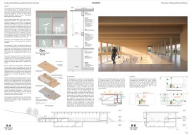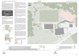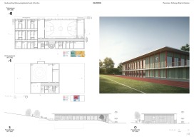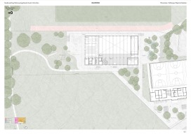 Die neue Mehrzweckhalle wird von vier verschiedenen, unterschiedlich gestalteten Aussenräumen umspielt. Durch diese Verteilung der verschiedenen Aussenraumanforderungen rund ums Gebäude werden die Nutzungen voneinander entflechtet, es resultieren keine Konflikte. Es entsteht ein allseitiges, spannendes Zusammenspiel von Innen-und Aussenräumen. Vom Ankunftsplatz her, bei der bestehenden Halle, sieht man bereits den Haupteingang der neuen Halle. Ein behindertengerechter Weg führt direkt auf das Belvedere zum Haupteingang. Von hier hat man einen schönen Blick auf die Gemeinde Schmitten mit der Kirche und die umgebende hügelige Kulturlandschaft. Auf der Westseite befindet sich eine beliebig nutzbare Terrasse mit direktem Bezug zum Mehrzwecksaal. Von da aus führt ein Weg am neuen Naturspielplatz das fein gestaltete Gelände hinauf an den Waldrand und schliesst ans bestehende Wegenetz an. Nördlich der Halle befindet sich der bestehende Fussballplatz. Auf der Ostseite entsteht ein Platz zwischen den beiden Hallen und dem Schiesshügel. Dieser dient der Meteorwasserversickerung und ist gleichzeitig auch ein spannender Spiel-und Aufenthaltsraum. Die leicht versenkten Staudenflächen stauen sich nach Regenfällen mit Regenwasser ein. Die bestehende Skulptur erhält da auch einen neuen Platz. Der Retentionsplatz wird mit Weiden und Erlen bepflanzt. Ansonsten orientiert sich die komplett einheimische Baumverwendung am nahen Wald. Beim Spielplatz und in der Böschung beim Haupteingang werden Ahorne, Föhren, Linden und Buchen gemischt gepflanzt.
