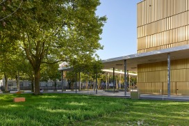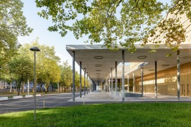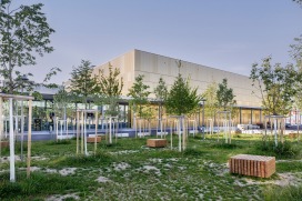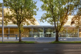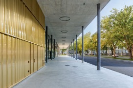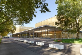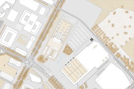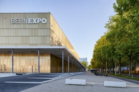 Die neue Festhalle auf dem Messegelände der BERNEXPO setzt sich aus einer Multifunktions- und einer Eventhalle zusammen, die von einem verbindenden Laubengang umspielt werden. Die Fläche zwischen der neuen Festhalle und den bestehenden Hallen wird temporär als Messeplatz genutzt. Wenn keine Messen stattfinden, wird es zum öffentlichen Raum mit Parkplätzen, einem Baumplatz mit Aufenthaltsmöglichkeiten und einem Bereich mit 20 Wasserdüsen, welche vor allem im Sommer dem Quartier einen Mehrwert bieten soll. Auch mobile Möblierungselemente sind Teil der Gestaltung und bespielen den ganzen Platz. Wichtige Langsamverkehrsachsen für Fussgänger und Velofahrer führen über den Platz in Richtung Allmend. Die alten Platanen am Guisanplatz bleiben bestehen, ergänzende Bäume finden auf dem Baumplatz als Vermittler zwischen den beiden Hallen ihren Standort. Das Dach wird neben einer PV-Anlage zum neuen ökologischen Standort für Insekten und Pflanzen.