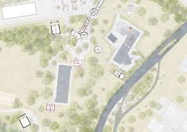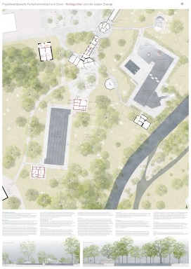 Auszug aus dem Projektbeschrieb Wettbewerb: ...das bestehende Bad bleibt erhalten und wird durch neue Elemente ergänzt. Herzstück ist der Eschenhain, der die besondere Atmosphäre eines Waldbades vermittelt. Neu hinzu kommen ein 50-Meter-Becken, das präzise zwischen Liegewiese und Eschenhain platziert ist, sowie ein Kinderbecken mit Düsen und Kanälen zum Spielen. Zwei neue Pavillons spannen das Schwimmbad auf und schaffen den Übergang zur Architektur. Wichtig war dabei ein behutsamer Umgang mit dem Bestand: das bestehende Bad, die Pavillons und der Eschenhain werden respektvoll eingebunden...