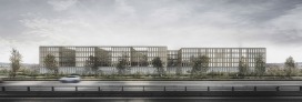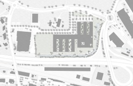 Die Höfe dienen den Nutzern als Aufenthalts- und Pausenraum. Schirmförmige Heister schützen vor Einsicht von oben, spenden Schatten und garantieren den Nutzern eine gute Aufenthaltsqualität. Bepflanzungen mit Stauden und niedrig wachsenden Sträuchern entlang der Längsfassaden sorgen für Blüte durch das ganze Jahr und schaffen ein angenehmes Klima. Die Bepflanzungen differieren von Hof zu Hof und sorgen mit unterschiedlichen Wuchsformen, Blütenfarben, Blattformen und Herbstfärbung für Unverwechselbarkeit. Der offen gestaltete Vorplatz wird mit einer Gehölzgruppe akzentuiert und stärkt die Adressbildung des eingezogenen Hauptzugangs. Sitzgelegenheiten laden zum Verweilen ein, integrierte bauliche Massnahmen verhindern eine direkte Zufahrt auf den Vorplatz. Die Allee entlang der neuen Juchstrasse nimmt die geforderten gedeckten Veloabstellplätze packetweise auf und strukturiert den Strassenraum. Ladestationen im Gebäude ermöglichen das Laden von E-Bike-Akkus. Die Besucherparkplätze werden mit einer weiteren Baumreihe parallel zur Allee in die städtische Vorzone eingebunden. Der offene, grosszügige Anlieferungsplatz wird peripher im Nordwesten direkt ab der neuen Juchstrasse erschlossen. Seine Grösse erlaubt multifunktionale Nutzungen. In diesen Bereich wird auch die Tankstelle integriert. Ungedeckte Veloabstellplätze werden entlang der Besucherparkplätze angeboten. Der geforderten Fuss- und Radweg im Südosten verbindet die urbane Juchstrasse mit dem revitalisierten Bachraum. Zwischen Gebäude und den Grundstücksgrenzen ist ein attraktiver und ökologisch wertvoller Naturraum aufgespannt: Trockene Magerwiesen, Gehölzgruppen und wechselfeuchte Zonen bieten mannigfache Entwicklungsmöglichkeiten für heimische Fauna und Flora. Die wechselfeuchten Zonen werden mit dem Dachwasser des Gebäu- des gespiesen. Durch diesen Naturraum führt ein chaussierter mäandrierender Fussweg, der teilweise mit der um das Gebäude laufenden Feuerwehrzufahrt und dem Unterhaltsweg des Baches korrespondiert. Die Feuerwehrzufahrt wird in Kiesrasen erstellt. Ein Aufenthaltsbereich ist in diesen Naturraum eingebunden und wird sinngemäss naturnah gestaltet.