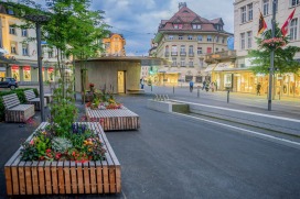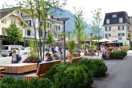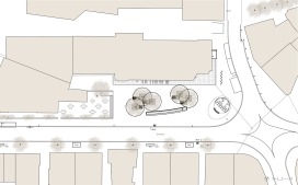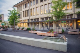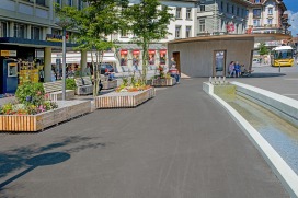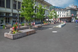 Der Postplatz ist der Ortsmittelpunkt von Interlaken und wird rege genutzt. Er ist ein Ort für Begegnungen und ein Ort zum Verweilen. Viele der bestehenden Eigenschaften sind bewahrt und in die Neugestaltung transformiert worden. Das neue Toilettengebäude liegt an der Ecke zur Kreuzung und wird Bindeglied und Angelpunkt zwischen Postplatz und Stadtraum. In Anlehnung an die Form und Lage des aufzuhebenden Mauer- und Wasserelementes übernimmt ein neuer, fein gebogener länglicher Brunnen, mit einem strassenseitig auf Sitzhöhe erhöhten Brunnenrand, wichtige Eigenschaften des Platzes. Fünf, in zwei Gruppen angeordnete, mehrstämmige Gleditschien (Lederhülsenbäume), bilden leicht schattierte Aufenthaltsbereiche. Sie nehmen Rücksicht auf die wichtigsten Fußgängerbeziehungen in diesem Stadtraum.