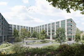 Die Aufwertung des Innenhofes schafft eine «Mikro-Landschaft» und gibt den Bewohnern die Möglichkeit, durch diesen grosszügigen Garten voller abwechslungsreicher Pflanzen zu spazieren. Durch die schräge Topographie entstehen unterschiedliche Teilbereiche und Durchbrüche in der Landschaft. Ein Rundweg erschliesst den Hof. Zwischen offenen Räumen, im Schatten von Bäumen oder beim Brunnen am Wasser bietet dieser Spaziergang eine Vielzahl unterschiedlicher Atmosphären, die der Entspannung und dem Austausch dienen. Die Artenwahl der Pflanzen zeigt in den verschiedenen Jahreszeiten unterschiedliche Blüten und Herbstfarben.