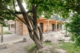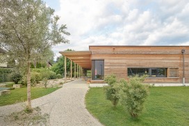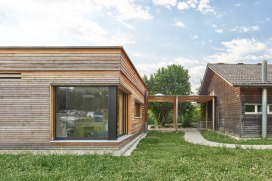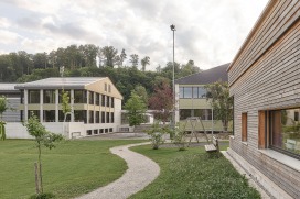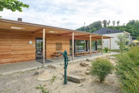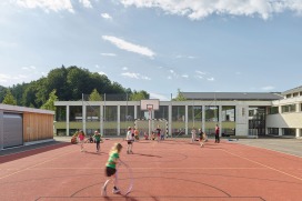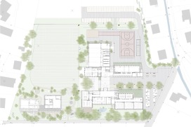 Die Primarschulanlage Stämpbach ist ein wichtiger sozialer Ort für die Gemeinde Vechigen. Zentral gelegen vernetzt sich die Anlage über die qualitätsvolle Architektur und beziehungsreichen Aussenräume mit ihrer Umgebung. Das Projekt Gesamtsanierung und Erweiterung Schulanlage Stämpbach baut auf dieser Lesart der bestehenden Situation auf. Die bestehende Schulhausanlage wurde saniert und um ein Werkgebäude, eine Kindertagesstätte, einen Kindergarten, Gruppenräume und ein Aussenmagazin erweitert. In diesem Zusammenhang wurde die Umgebung neu projektiert und unter Betrieb umgestaltet. Der Umbau erfolgte in drei Etappen mit speziell angelegten Baupisten. Die Trennung von Bau- und Schulbetrieb war ein wichtiger Bestandteil der Arbeit, ebenso die Studien für Massnahmen zum Hochwasserschutz gegen den Stämpbach. Als gesamtes Projekt betrachtet ist eine Schulhausumgebung für alle Altersklassen entstanden. Die Parkplätze im Zugangsbereich wurden in die nordwestliche Peripherie verschoben und der Zugangsbereich konnte damit als Aufenthalts- und Empfangsbereich freigespielt werden. Ebenso konnten die notwendigen gedeckten Fahrradunterstände beim Zugangsbereich angeordnet werden. Der neue Kindergarten wurde an das bestehende Bauvolumen angegliedert und um eine Matschanlage erweitert. Der bestehende Quartierspielplatz wurde umorganisiert und den neuen Platzverhältnissen angepasst. Im grossen Pausenplatz wurde ein Allwetterplatz aus Kunststoffbelag integriert. Im Zusammenhang mit der Umgebungsumgestaltung wurden die Aussenbeleuchtung erneuert und die bestehende Bepflanzung ergänzt.
