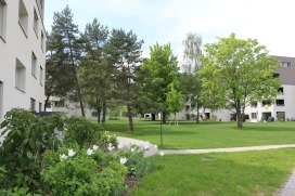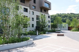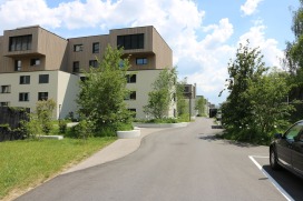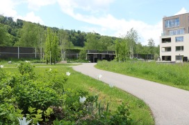 Die Siedlung aus den 1970er Jahre hat eine grosszügige Umgebung mit schönem Baumbestand. Sie wird durch die Gebäudeaufstockung von zwei Geschossen verdichtet und saniert. Viele Teile des Freiraumes können damit erhalten bleiben und auch aufgewertet werden. Durch die Erweiterung der Einstellhalle kann die zuvor vertiefte Erschliessungszone angehoben werden. Dadurch erfährt die Gesamtanlage eine starke Aufwertung: Der lange Erschliessungskanal verschwindet, die Adressbildung zu den Wohnbauten wird klarer. Die lange Gerade der Erschliessung wird durch die geschwungenen Formen und das Anlegen von grünen Pflanzhügeln in der Sichtachse gebrochen, damit wird die Geschwindigkeit des motorisierten Individualverkehrs reduziert. Zwischen den Gebäuden ist sie zu Platzsituationen ausgeweitet. Es entstehen gut frequentierte Begegnungszonen. Die Zugangswege von den Aufenthaltsplätzen zu den Wohnbauten erfolgen als weich geschwungene Wege. Sie führen durch artenreiche Blumenrasen mit eingestreuten Wildblumentuffen. Im Nordosten bildet ein Mergelweg die Möglichkeit eines Rundganges. Er durchläuft eine offen gestaltete Landschaft, welche die Sicht auf den gegenüberliegenden Aaretalhang ermöglicht. An diesem Weg werden konzentriert zwei Spielplätze angelegt, mit danebenliegenden Rasenspielfeldern. Die bestehenden Bäume werden soweit möglich erhalten, gefällte Bäume werden ersetzt, die Baumbilanz fällt positiv aus. Die bestehende Wildhecke wird erhalten und mit einheimischen Arten ergänzt und aufgewertet. Besucherparkplätze, Containerunterstände und ungedeckte Veloabstellplätze liegen an der Erschliessungszone.