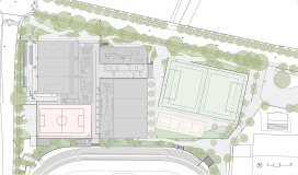 Das Gelände ist Teil eines Sport- bzw. Bildungsclusters mit verschiedenen Schulen, dem alten Neufeldstadion, einer Tennisanlage und weiteren Kunstrasenfeldern im Raum Bern - Neufeld. Durch das Heranrücken der neuen Dreifachturnhalle und des Institutgebäudes an den Bestand entsteht eine besondere Dichte, welche mit dem umgebenden Freiraum kontrastiert. Das weitere Gelände bleibt als räumlich durchlässiger Bestandteil des öffentlichen Raums erkennbar. Dies wird durch die Stärkung von fussläufigen Quartiersverbindungen und in der baulichen Ausformulierung lesbar gemacht. Als ausdrucksstarkes vegetatives Element der Umgebung werden die Wiesenflächen und Einzelgehölze des in Sichtweite gelegenen Waldparks als Leitmotiv aufgenommen. Zum neuen Freiraum gehören auch ein Kunstrasen - Fussballplatz, ein Boulderstein und eine polyvalent nutzbare Studier- und Sportzone mit Asphaltbelag und Sitz- und Aufenthaltsmöglichkeiten unter locker wachsenden Gehölzen